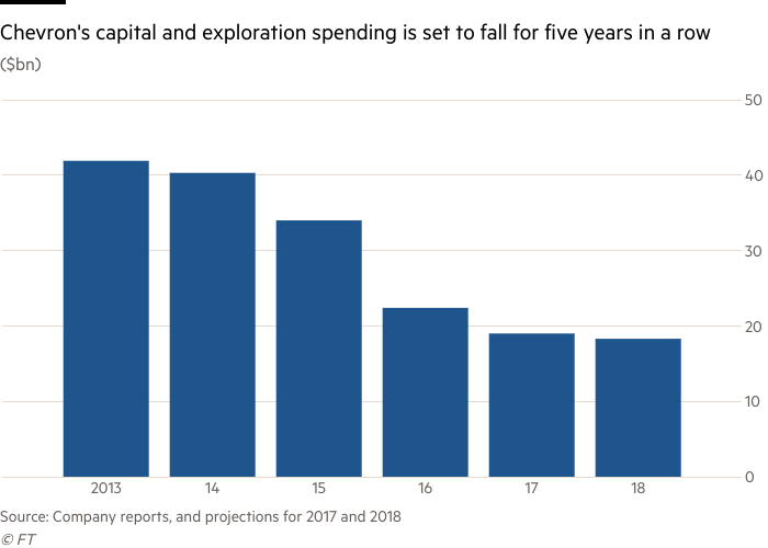 Chevron’s capital and exploration budget of $19.8bn for this year is about half what it was at its peak in 2013-14, and operating expenses are back down to where they were eight years ago, Mr Watson said.