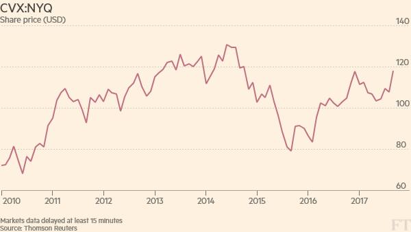 Over the past decade, Chevron’s shares have greatly outperformed those of its rival ExxonMobil, rising by 33 per cent while Exxon’s fell 9 per cent. However both companies have lagged behind the S&P 500 index, which rose 71 per cent over that period.