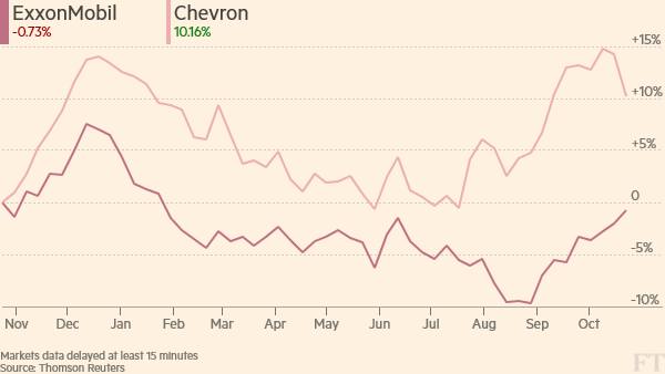 Chevron, meanwhile reported a 51 per cent rise in earnings per share to $1.03 for the third quarter, helped by the strength of its downstream refining and marketing operations and a one-off gain of $675m. Excluding that gain and other one-off items, earnings per share were 85 cents below analysts’ average forecast of 99 cents.