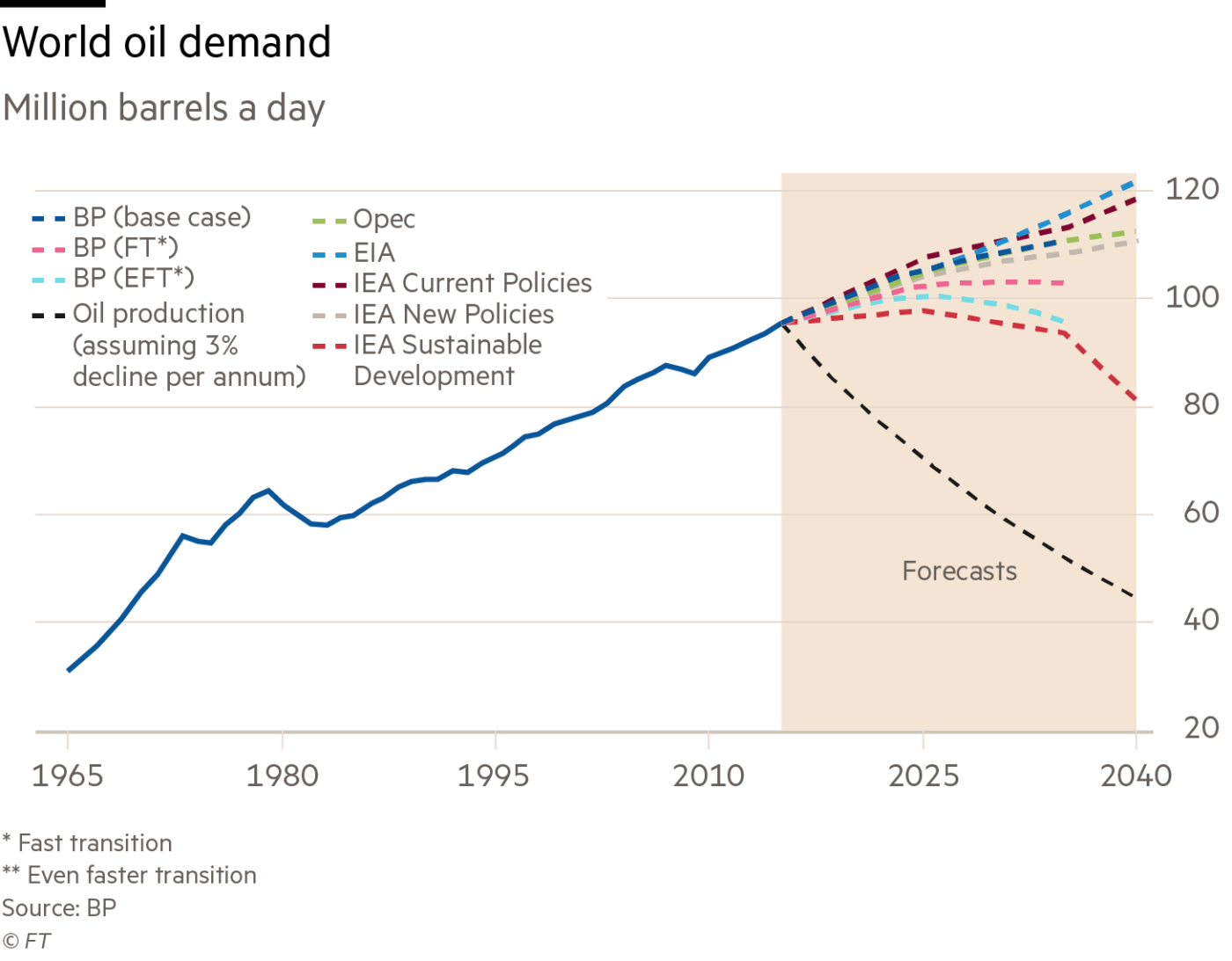 Forecasts for when a peak occurs span a 25-year period, with those estimating an earlier timeframe basing predictions on the rapid adoption of electric cars and harsher environment regulations. BP’s base case has oil consumption growing until 2040, while rival Royal Dutch Shell said a peak could arrive in the next 15 years.