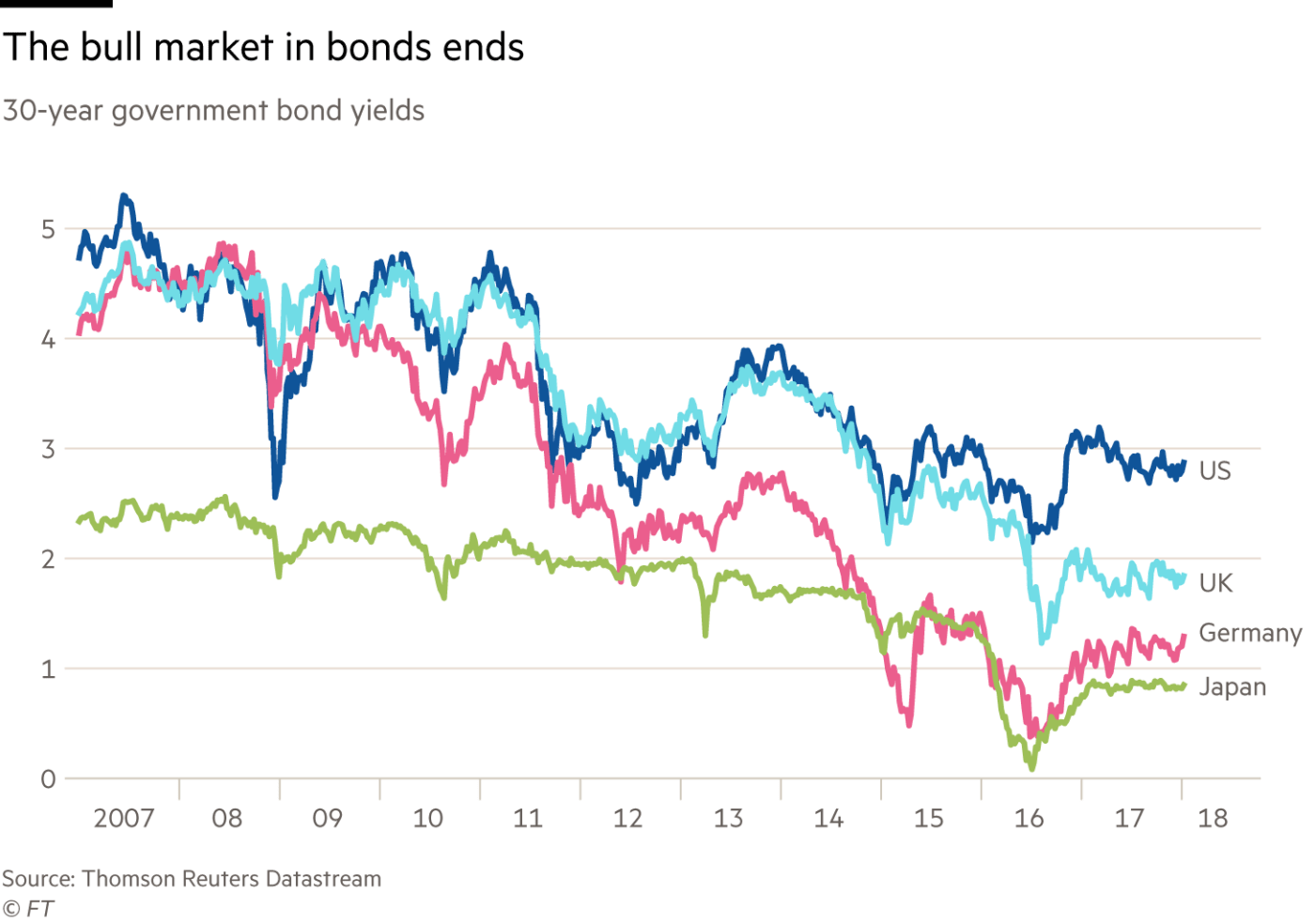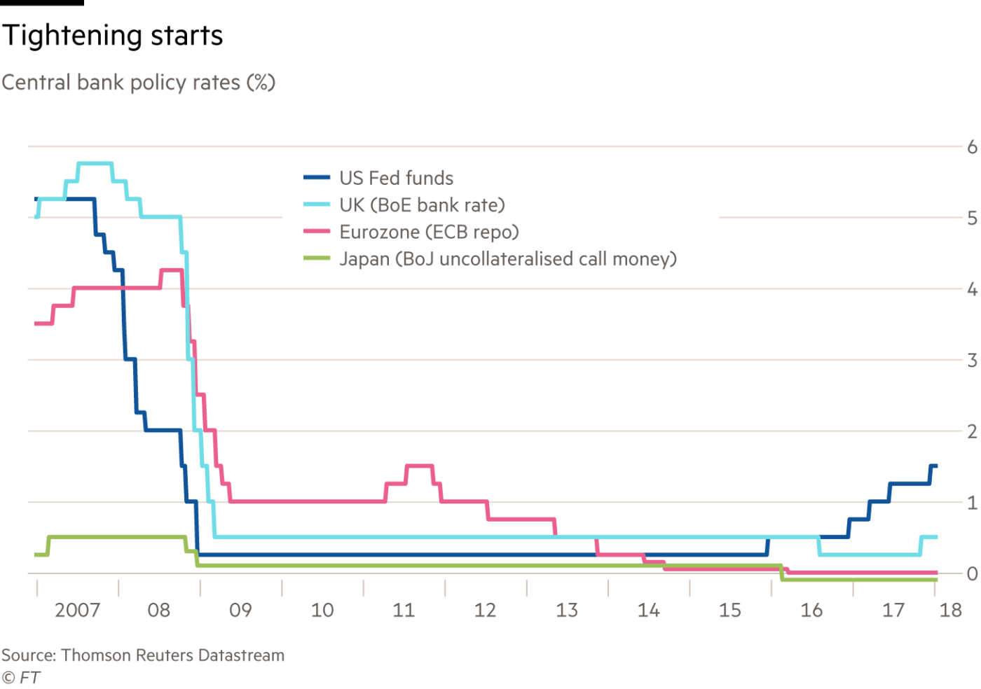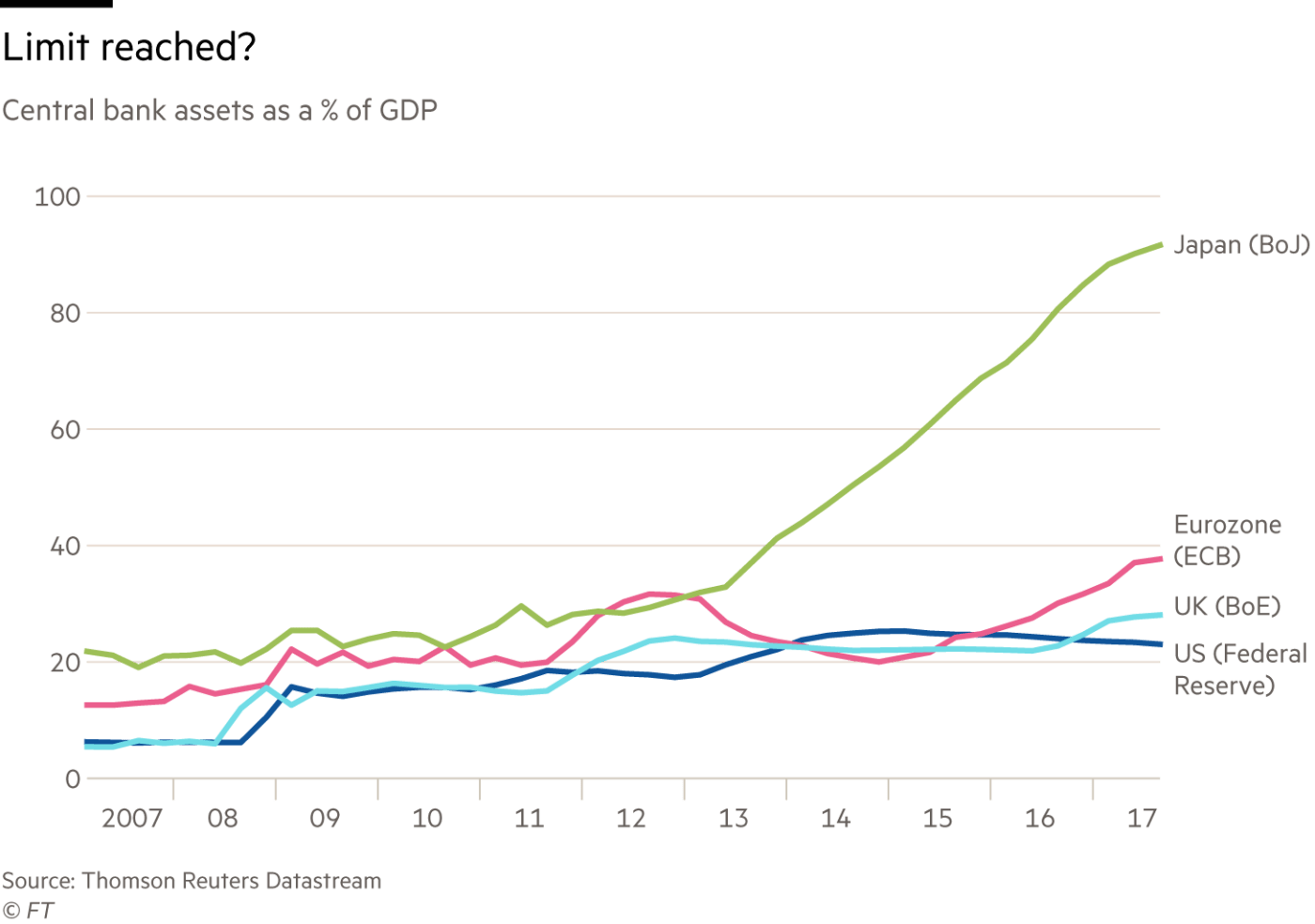 In the event, monetary policy remained strongly supportive — indeed, in the cases of the European Central Bank and the Bank of Japan, became far more supportive — in subsequent years. Yet now, at last, the idea of “normalisation” is gaining hold. The Federal Reserve has raised its policy rates five times, from 0.25 to 1.5 per cent. The Bank of England has raised its policy rate once, albeit only back to 0.5 per cent. Even the ECB is indicating it might cut its crisis-era stimulus programme faster than expected (see charts).