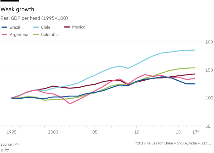 Nevertheless, the structural economic and political challenges are huge. Income inequality remains among the highest in the world. That is not offset by fast growth: between 1995 and 2016 real gross domestic product per head rose just 25 per cent, putting Brazil behind Argentina, Mexico, Colombia and Chile. Relative to the US, Brazil’s real GDP per head has stagnated over the past quarter of a century. It is a little over a quarter of US levels, which makes this failure to catch up disturbing.