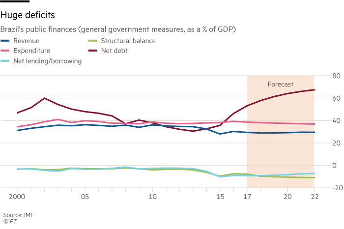 Poor growth prospects make the dire fiscal position worse. Brazil has a huge structural fiscal deficit: the IMF thinks it will reach 11 per cent of GDP by 2022. Revenue is already quite close to 30 per cent of GDP. This should rise with the recovery, but not by enough to close the deficit and bring the rise in public indebtedness under control, since spending is close to 40 per cent of GDP. The government’s mandated spending cap will run into mandated spending, especially on pensions. By the early 2020s, it would have to eliminate all discretionary spending.